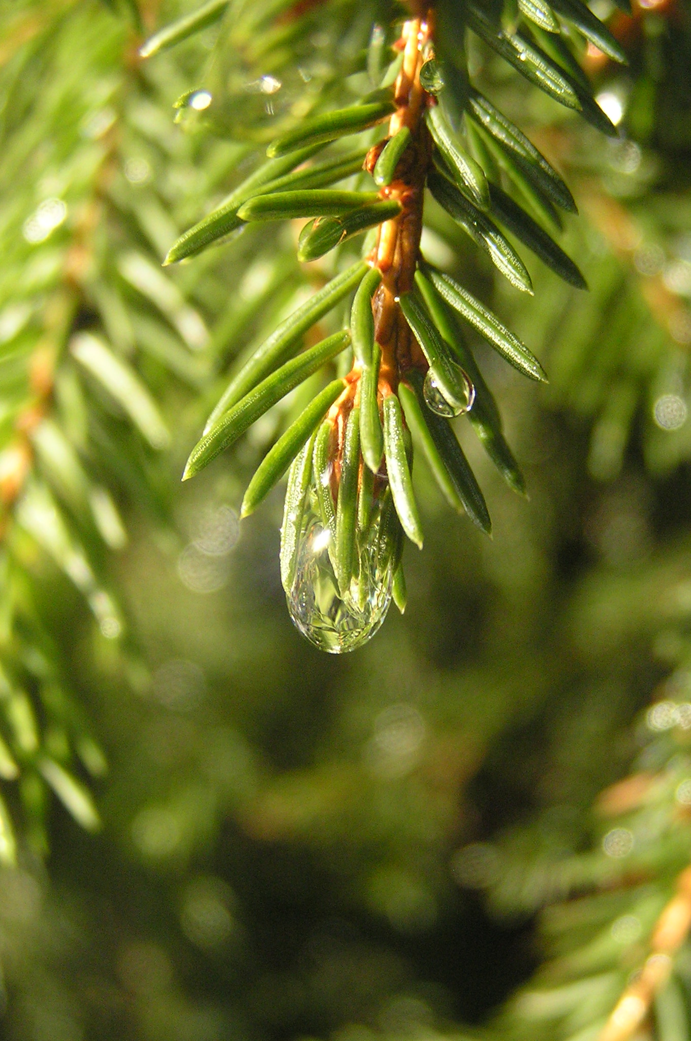 Капля расстаявшего снега на ветке смереки.